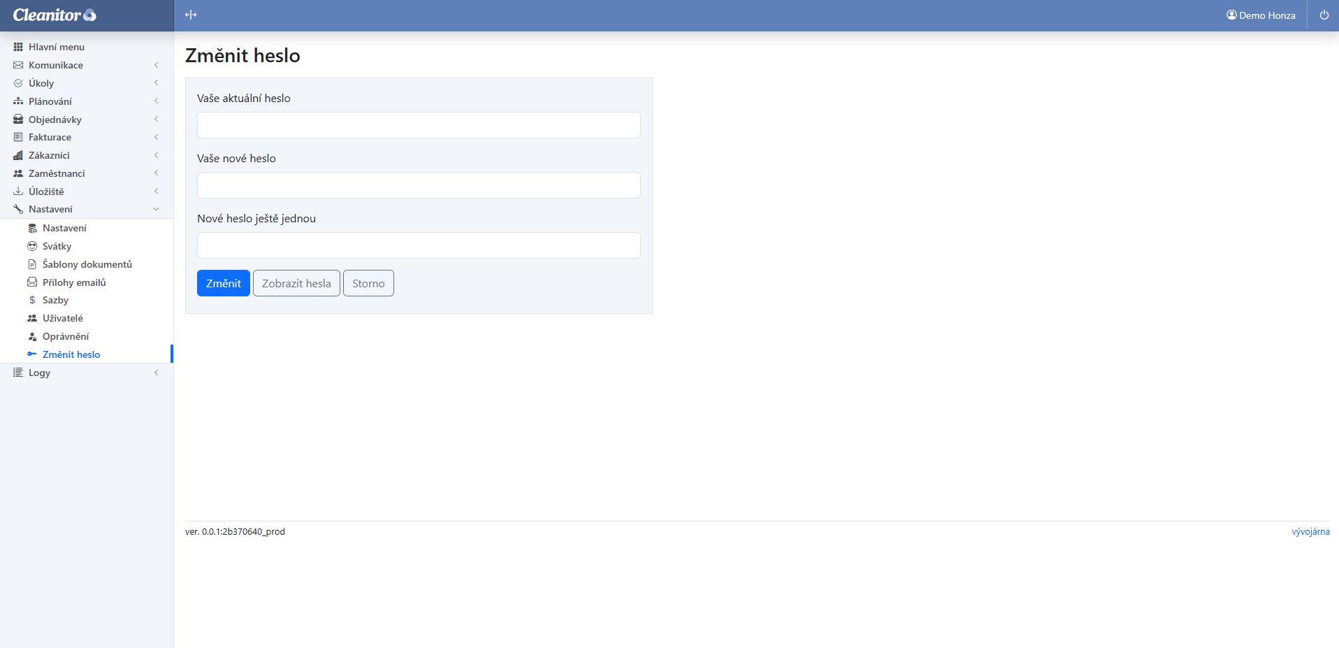 Kterýkoliv uživatel informačního systému pro úklidovou firmu Cleanitor si může sám změnit přístupové heslo v menu Nastavení / Změnit heslo.