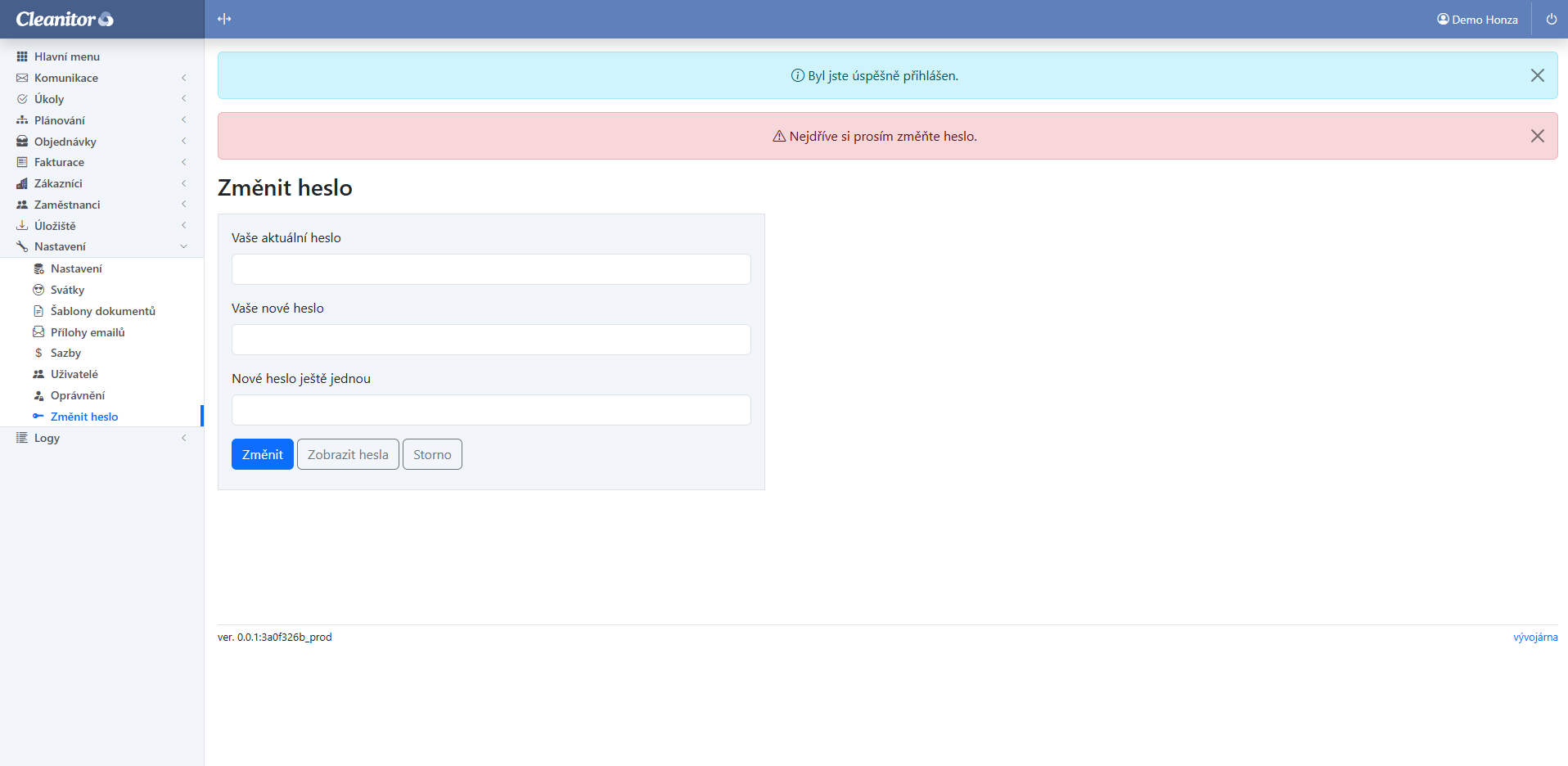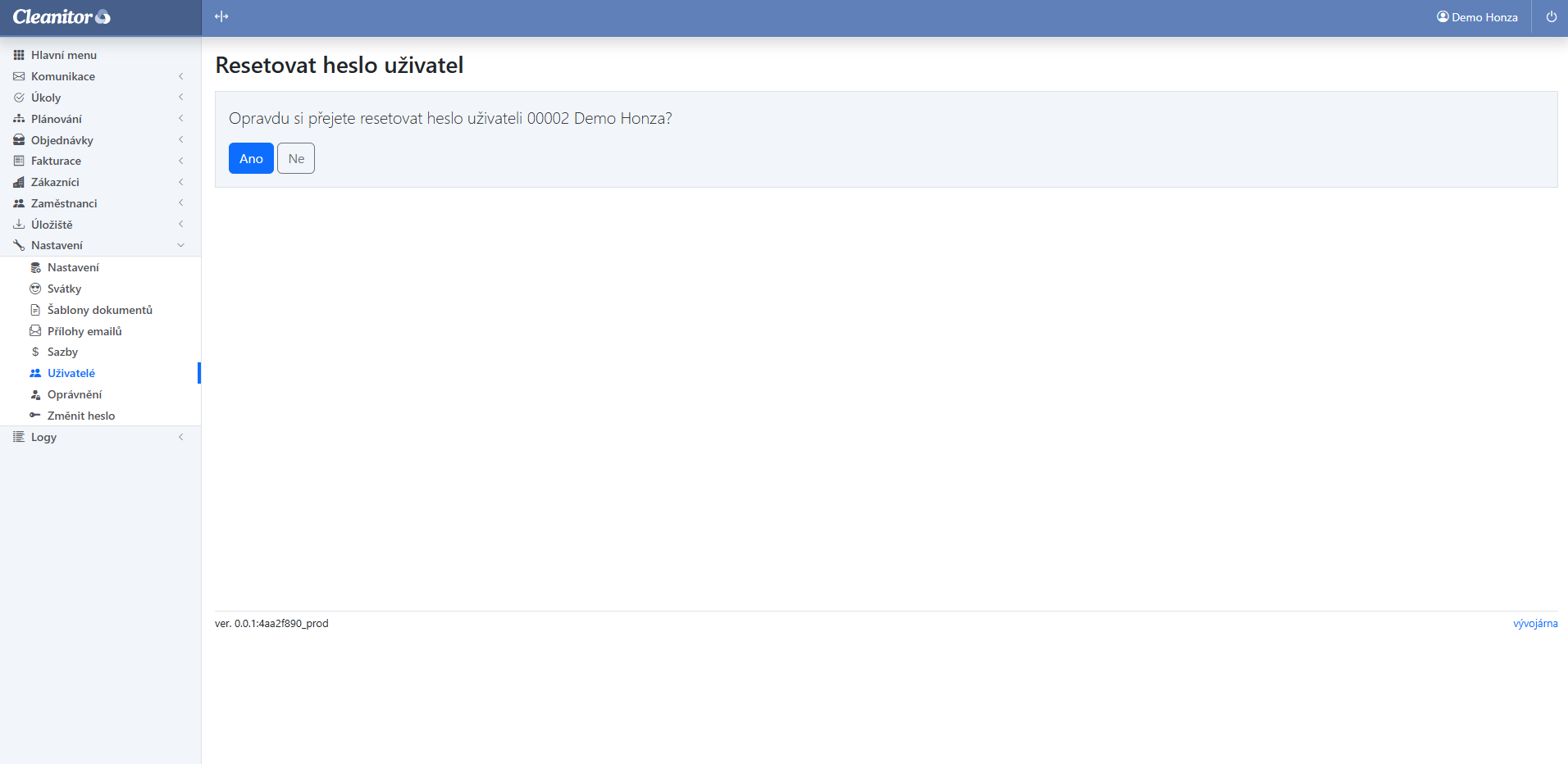 Heslo lze v informačním systému Cleanitor resetovat pomocí odkazu s ikonou klíče u konkrétního uživatele ve správě uživatelů. Tato funkce nastaví danému uživateli defaultní heslo, kterým je jeho e-mailová adresa. Poté co se daný uživatel znovu přihlásí do systému Cleanitor pomocí defaultního hesla, bude automaticky vyzván, aby si nastavil nové heslo a přesměrován na funkci pro změnu hesla. Zde zadá původní heslo - tedy e-mailovou adresu a dva krát nové heslo. Než si uživatel nastaví nové heslo, nebude mít přístupné žádné jiné funkce informačního systému Cleanitor.