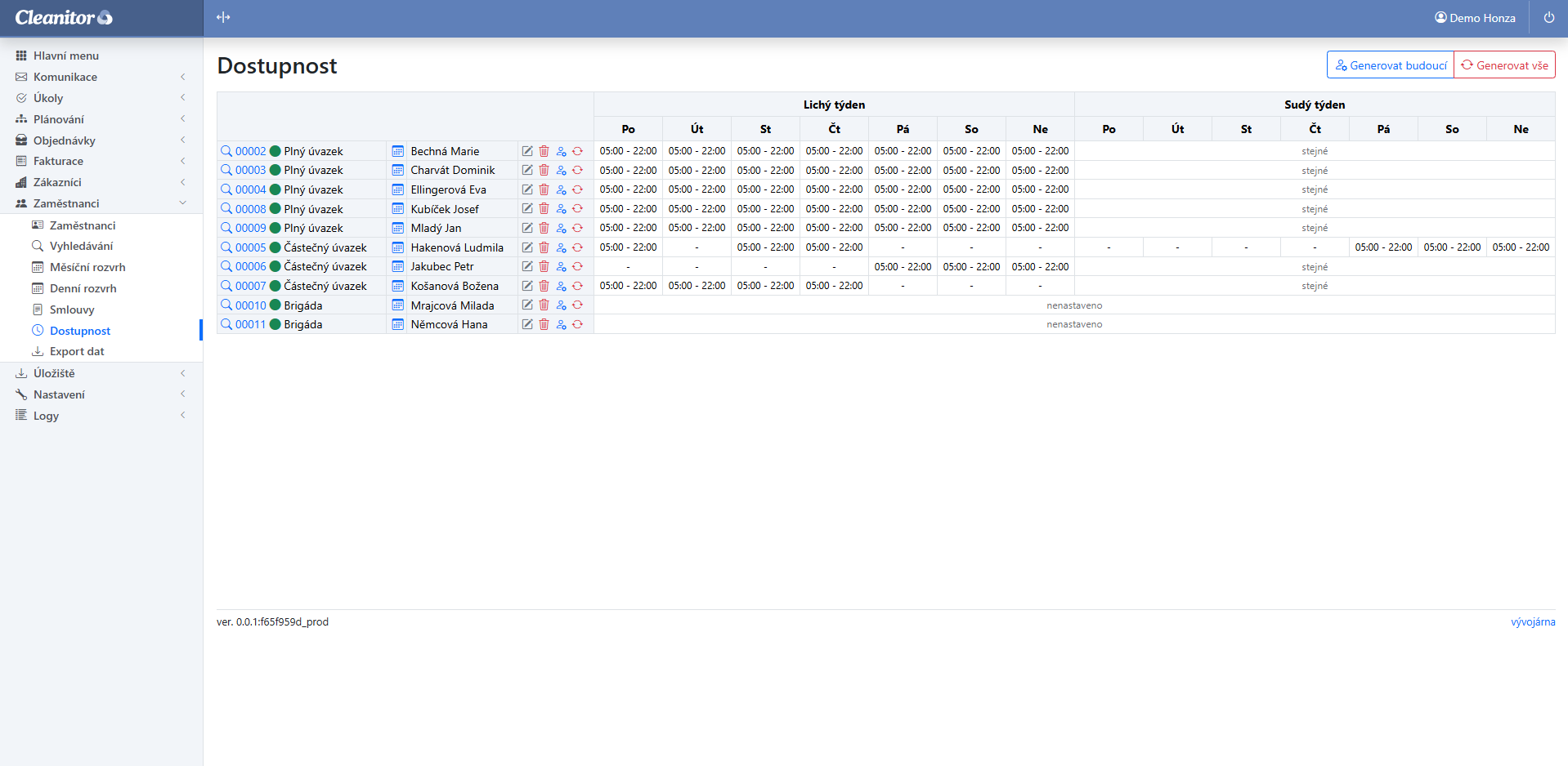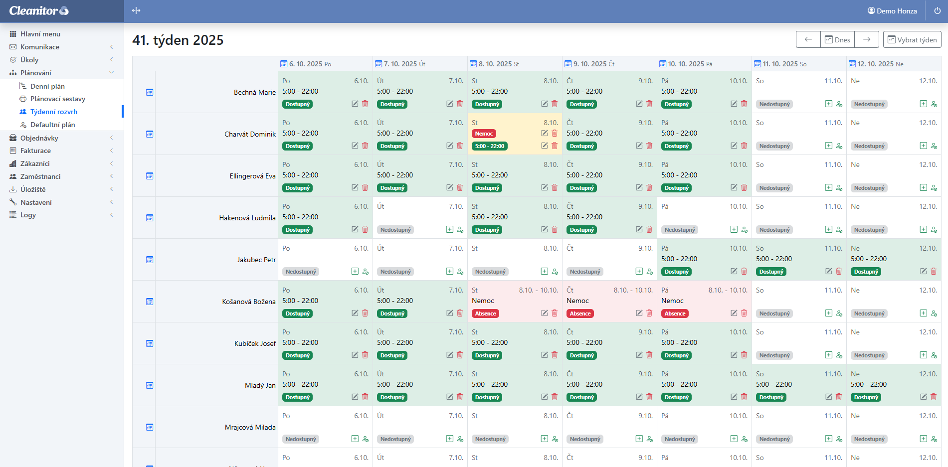 Pro plánování směn, nebo rozvrhů zaměstnanců je v informačním systému Cleanitor dostupný mechanizmus pro definici dostupnosti zaměstnance. Dostupnost zaměstnance určuje, kdy (nebo lépe které dny a od kdy do kdy) je daný zaměstnanec dostupný k plánování práce. V systému Cleanitor pak lze pro každého zaměstnance definovat rozvrh dostupnosti daného zaměstnance.