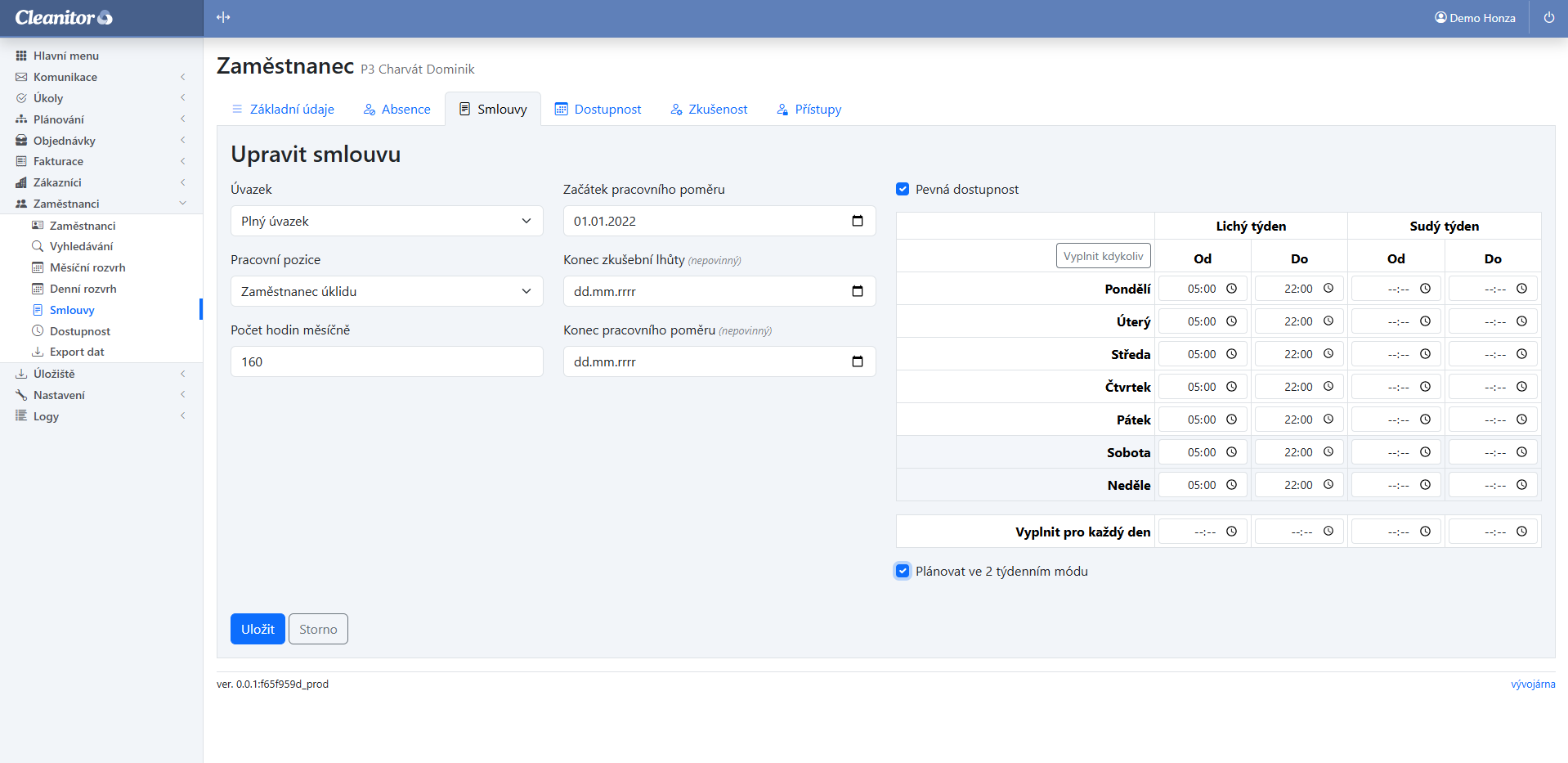 U přidání smlouvy lze zakliknout parametr Pevná dostupnost a nechat systém Cleanitor generovat dostupnost zaměstnance z této smlouvy. Pevnou dostupnost lze zadat v jedno týdenním módu, kdy lze ve vybrané dny v týdnu zadat hodiny dostupnosti. Lze ji ale také zadávat ve dvou týdenním módu, kdy lze jinak nastavit sudý a lichý týden. Více o generování dostupnosti zde v článku Dostupnost zaměstnance.